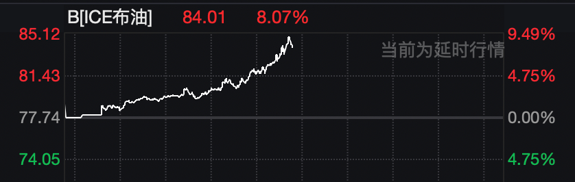 原油则持续大涨。截至发稿,布伦特原油日内涨超8%,报84.01美元/桶。WTI原油盘中也涨超8%,最新涨幅为7.58%,报76.63美元/桶。