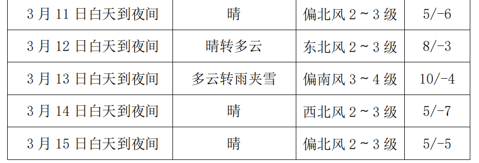 预计本周(2026年3月9日-15日),我市天气趋势是:气温偏高,降水接近常年。全市平均气温0℃左右,比常年同期-3.0℃偏高。全市平均降水量2~3毫米,与常年同期2.1毫米接近。