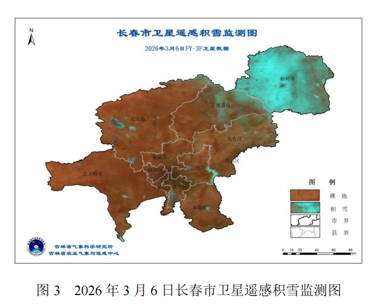积雪覆盖实况FY-3F卫星数据显示:3月6日长春市积雪覆盖区主要分布在榆树市、德惠市东北部和九台区北部,与前期相比积雪分布范围有所减少(图3)。