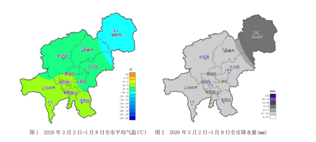 上周(2026年3月2日-3月8日),我市气温偏低,降水稍少。全市平均气温-6.8℃,比常年同期-5.2℃低1.6℃;全市平均降水量2.1毫米,比常年同期2.4毫米少0.3毫米。